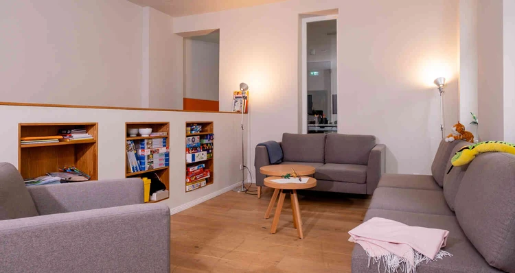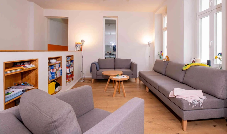 Unsere Klinik verfügt über drei Behandlungsteams, die jeweils einem eigenen Farbkonzept folgen. Jedes Team bietet mit seinen Räumlichkeiten eine eigene Lobby mit offener Küche und einem großen Esstisch, an dem jede und jeder Platz findet. Ein gemütlicher Sitzbereich sorgt für eine wohnliche Atmosphäre. Hier arbeiten, essen und leben wir gemeinsam. Auch finden hier täglich unsere Open-Staff-Sitzungen statt. Auf unseren „Stationen“ gibt es keine Büros. Wir mit Dir!