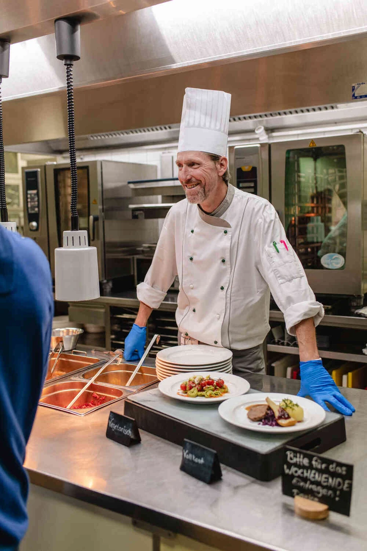 Bei uns kümmern sich Küchenchef Heinz Frommherz und sein Team um einen ausgewogenen und abwechslungsreichen Speiseplan. Zu den Hauptmahlzeiten können Sie zwischen verschiedenen Menüs, kalten und warmen Speisen wählen. Unsere Küche ist von regionalen und saisonalen Zutaten geprägt. Alle Mahlzeiten werden vom Küchenteam frisch zubereitet. Und auch auf spezielle Essenswünsche sind wir eingestellt – egal ob vegan, gluten- oder lactosefrei.
